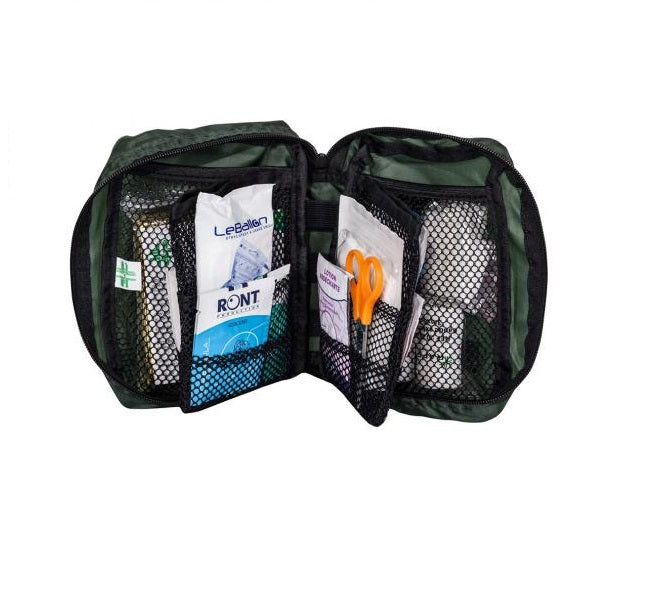 Les trousses de secours sont équipées du nécessaire pour effectuer les 1er soins et les soigner avec des pansements adhésifs de 20mm x 72mm, de pansements adhésifs 53mm x 70mm, pansements adhésifs 10cm x 6 cm, de sachet de compresses stériles 7.5cm x 7.5cm, de bandes extensibles 3m x 5cm, rouleau de sparadrap sécable 5m x 2cm, paire de ciseau à bout rond de 10 cm, pince à échardes à mors plats, paire de gants jetables, compresses nettoyantes à la chlorhexidine, compresses d'alcool à 70°, compresses anti-coup au canduela, compresse de lotion asséchante, dosette de sérum physiologique stérile, couverture de survie, sachet de gel décontaminant mains sans eau, coussin hémostatique d'urgence, lot de 2 pinces à tiques, écharpe triangulaire, épingles à sureté, doigtier en cuir, pulvérisateur de solution nettoyante, pulvérisateur de solution anti-coup, mèches hémostatiques stériles Coalgan, éthylotest chimique individuel à usage unique, 1 livret premier soin traduit en 10 langues.